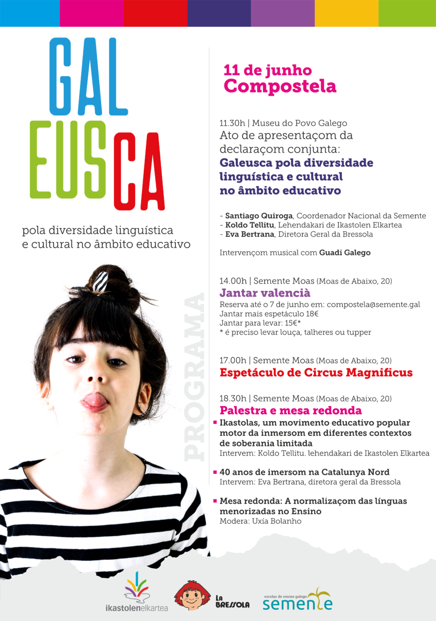 No vindouro sábado, 11 de julho às 11:30h no Museu do Povo Galego será apresentada a declaraçom conjunta Galeusca pola diversidade linguística e cultural no âmbito educativo que contará com a participaçom do lehendakari de Ikastolen Elkartea, da Diretora Geral da Bressola, do Coordenador Nacional de Semente e a música de Guadi Galego. A seguir […]